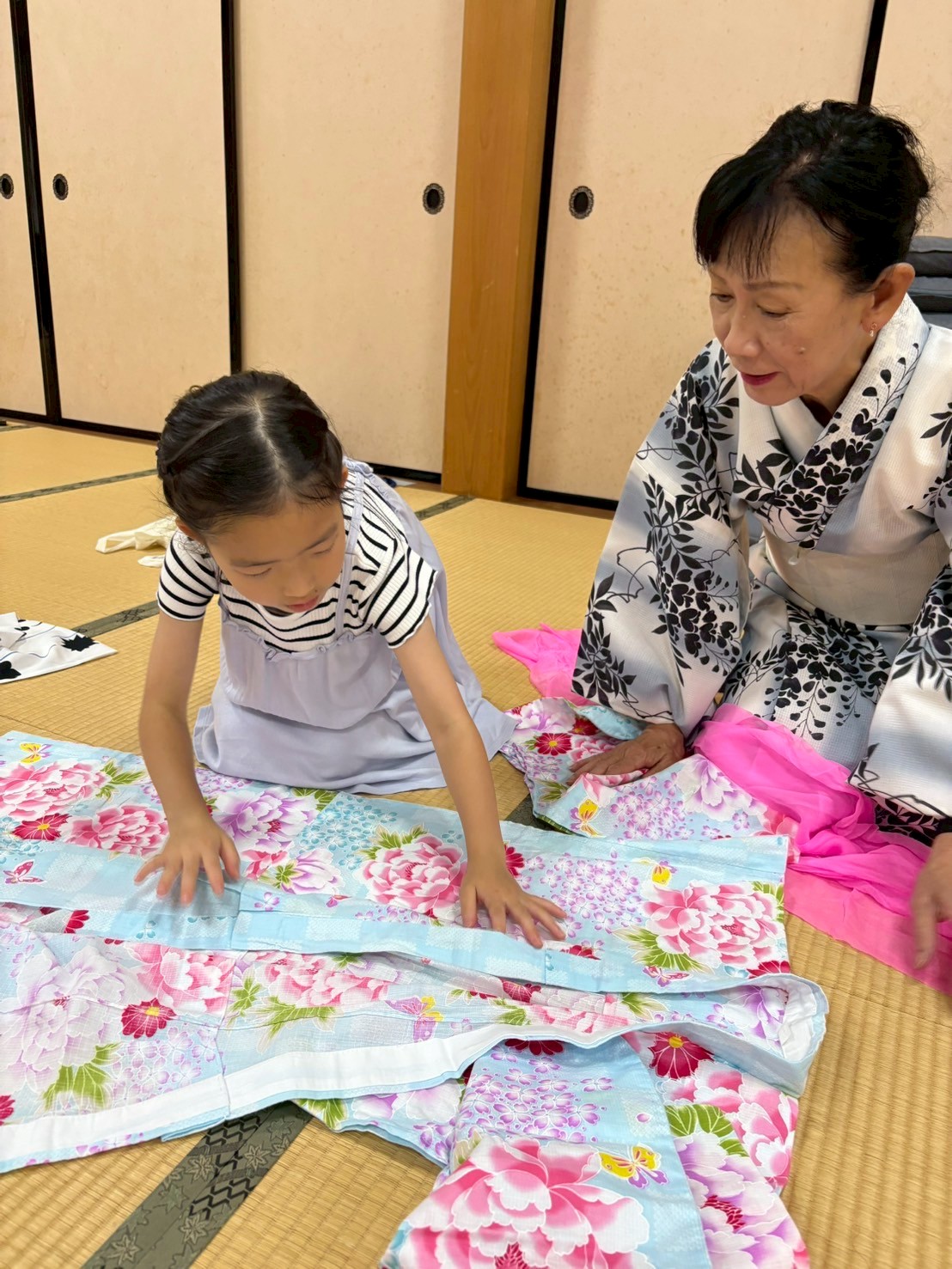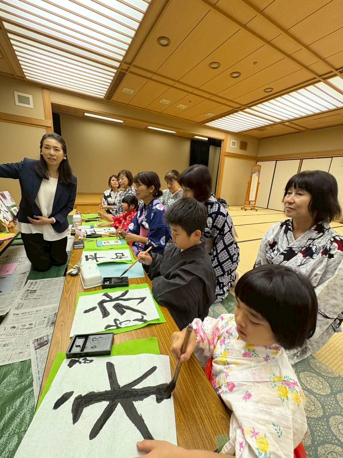 7月20日の親子体験イベントでは、邦楽の演奏録音(協力:藤森雅楽会)を鑑賞後、和装/礼法・書道の2講座を30分ずつ体験しました。和装/礼法では、浴衣を着て、和装に親しむ体験。書道では、今ここで感じる想いを、書道の筆で漢字一語で書く禅の一期一会にちなんだ「漢字る一語一会」体験を行いました。
