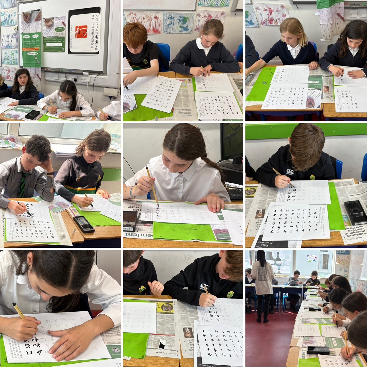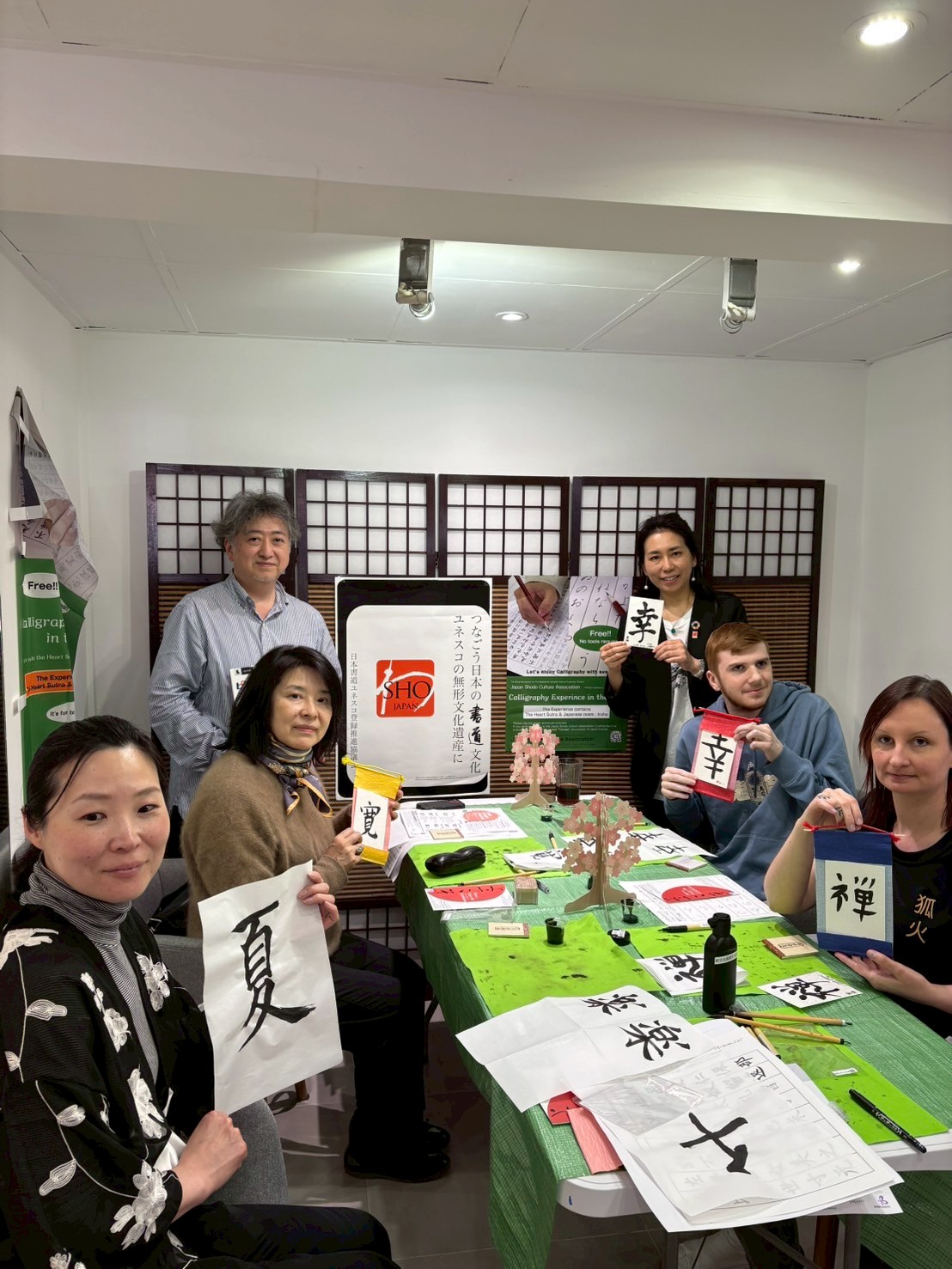 昨年 4 ⽉、10 ⽉に続き、ダブリン中心地で日本の文化発信地であるハウスオブジャパンへ 3回⽬の再訪。継続的にご参加下さる方も多く 20 名ほど。フランスでの「漢字る⼀語⼀会」ビデオ映像鑑賞。 ⾳楽講師によるアニメ、漫画⾳楽「サマー」「アイドル」「千と千尋の神隠し」3曲のピアノ演奏鑑賞。書道講師による3つの曲のテーマの漢字「夏」「愛」「千」の揮毫。書道講師ユネスコオリジナル作品「瓏」を半紙に練習しカレンダーに清書。「漢字る⼀語⼀会」の発表。3回目の「街なか書道体験」(協⼒⽇本書道⽂化協会)実施。 和紙ハガキ配布。(協力(株)ならや本舗)今回もオーナー様ご夫妻のご支援を賜りました。