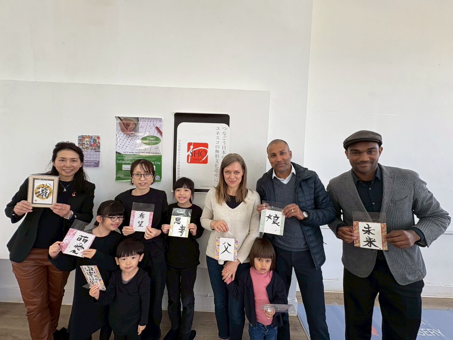 ロンドン⻄部アクトン地区にある雅幼稚園。 この辺りは緑豊かな住宅街であり日系の学校など⽇本⼈コミュニティーの拠点として広く知られている地域。バンクホリデー(休⽇)にも関わらず園児、⼩学⽣、海外駐在員や日本文化にご興味のある⾚ちゃん連れのご家族など参加者 15 名ほど。⽇本の書道⽂化紹介。書道ガイドブック「ようこそ」英語版配布。書道のユネスコ無形⽂化 遺産登録推進へ向けて「街なか書道体験」(協⼒⽇本書道⽂化協会)や今ここで感じる想いを漢字⼀語で表す「漢字る一語一会」好きな⾔葉や⾃分の名前などを和紙ハガキに清書して発表。(協力(株)ならや本舗)幼稚園代表にもご参加いただき、参加者から今までにないとても新鮮で楽しいイベントだったと多くのお声をいただきました。