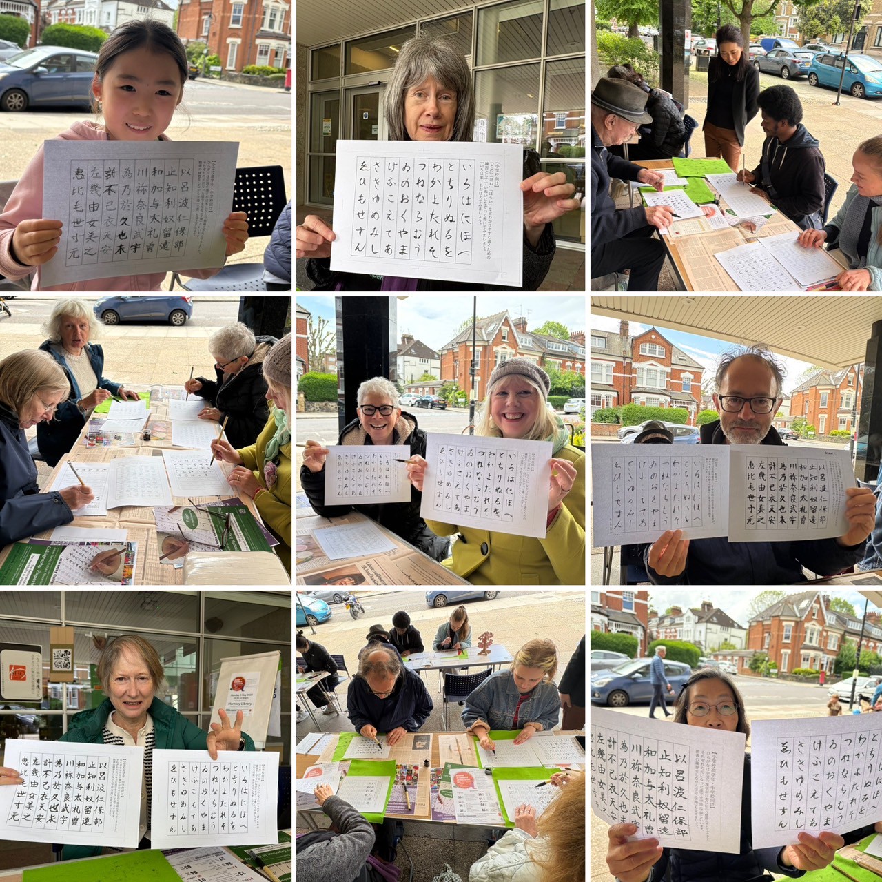 ロンドン北部ハーリンゲイの閑静な住宅街にある⽴派な図書館。 地元の憩いの場にて書道体験が初めての参加者 20 名ほどへ⽇本の書道⽂化紹介。ユネスコオリジナル書道作品「瓏」のご説明。漢字について⼤変興味深く⽿を傾ける参加者の皆さん。 書道ガイドブック「ようこそ」英語版配布。「街なか書道体験」(協⼒⽇本書道⽂化協会)いろは歌のひらがなや 漢字のなぞり書きの実施。和紙ハガキ配布。(協力(株)ならや本舗)筆と墨と半紙を持ち帰り、書道を自宅でも楽しみたいという参加者もいらっしゃいました。