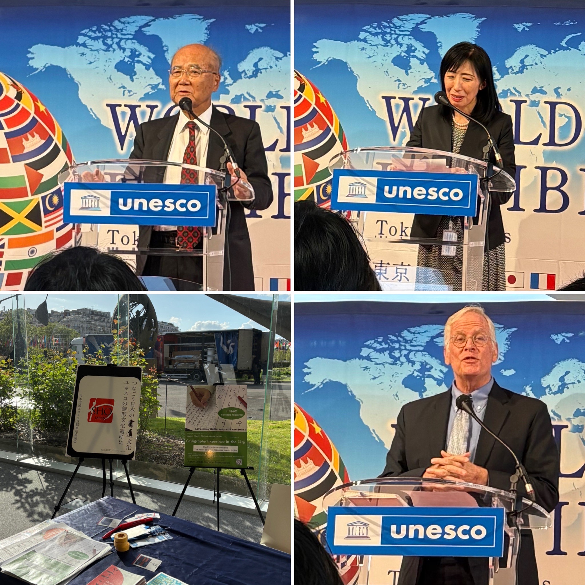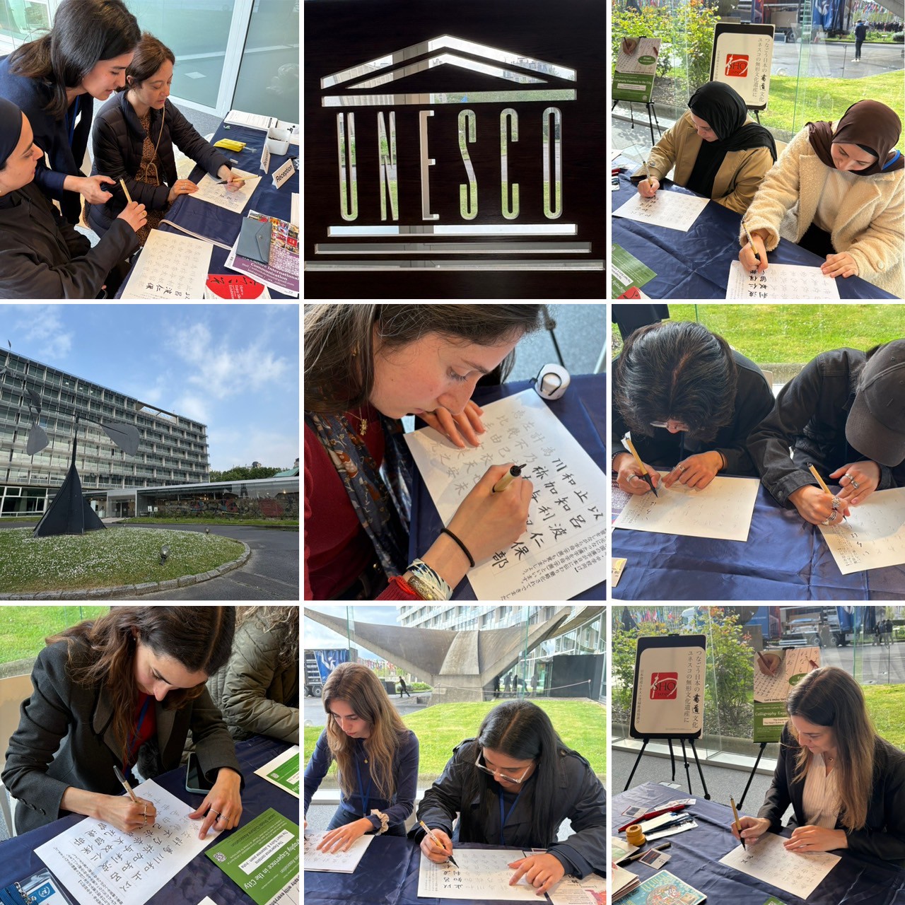 第⼆次世界⼤戦後、国連が発⾜されて 80 年を迎える 2025 年、平和の実現と多様性の尊重 を掲げるユネスコ国連パリ本部で開催された「国際平和美術展 2025」に参加、鑑賞会。 書道講師 鈎 凰樺氏の作品「瓏(ろう)〜日本と世界の歴史肖像270〜」の発表に伴い、2026年に迫る書道のユネスコ無形文化遺産登録推進のロビー活動として「街なか書道体験(協力:日本書道文化協会)実施。第8代国連事務局長松浦晃一郎氏、ユネスコ本部平和・持続可能な開発部デレクター クリストファー・キャッスル氏、ユネスコ日本政府代表部 平山直子氏はじめアルゼンチン大使、キューバ大使、パラグアイ大使、元マダガスカル大使ご夫妻や各国大使館職員、バルテュス節子氏など多くの皆様のご支援を賜りました。