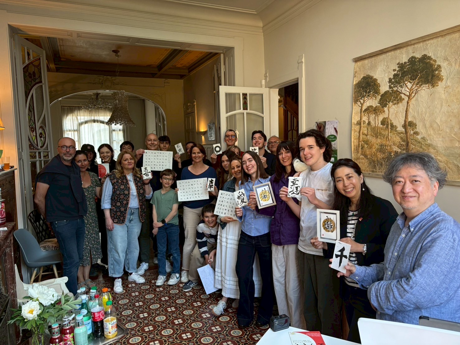 フランスでも大人氣の日本のアニメ、漫画。中でもフランスアニメファンが喜ぶジブリ作品「千と千尋の神隠し」を含む3曲を音楽講師がピアノ演奏。曲にちなんだ3つの漢字を書道講師らがそれぞれ揮毫。和文化を発信中のフランス人らも和装姿で参加。浴⾐の歴史(協⼒(⼀財)全⽇本和装コンサルタント協会)や⽇本の書道⽂化について熱心に耳を傾ける場面も。書道ガイドブック「ようこそ」英語版配布。「街なか書道体験」実施。(協⼒⽇本書道⽂化協会) 和紙ハガキ配布。(協力(株)ならや本舗)「漢字る⼀語⼀会」をそれぞれ発表。